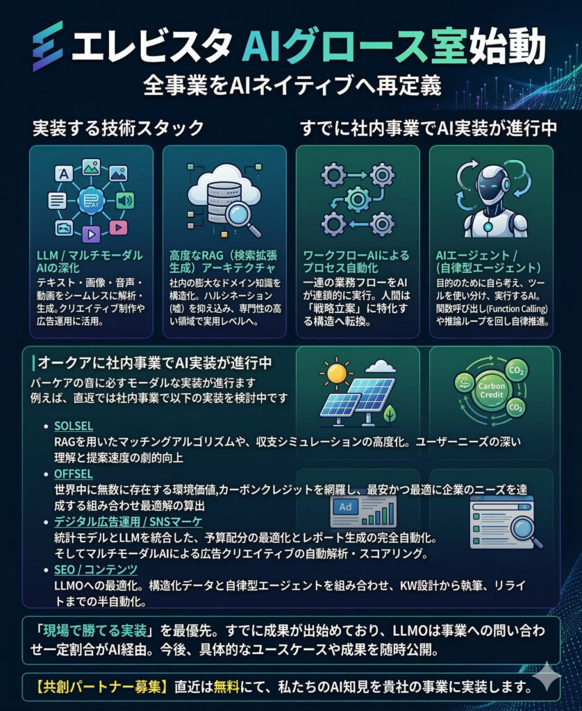 エレビスタ「AIグロース室」を新設。全事業をAIネイティブへ再定義し、「デジタル×●●」から、「AI×●●」な企業へと変貌します。