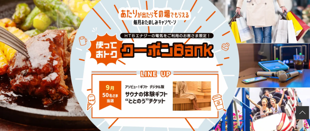 HTBエナジーを契約すると、グルメ・ショッピング・レジャーなどの割引に利用できるクーポンサービスが付いてきます。