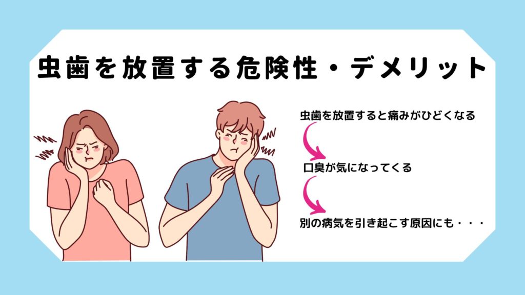 虫歯を放置すると痛みがひどくなります。その場合は神経に到達してしまっている可能性が高く、早期治療が必要です。