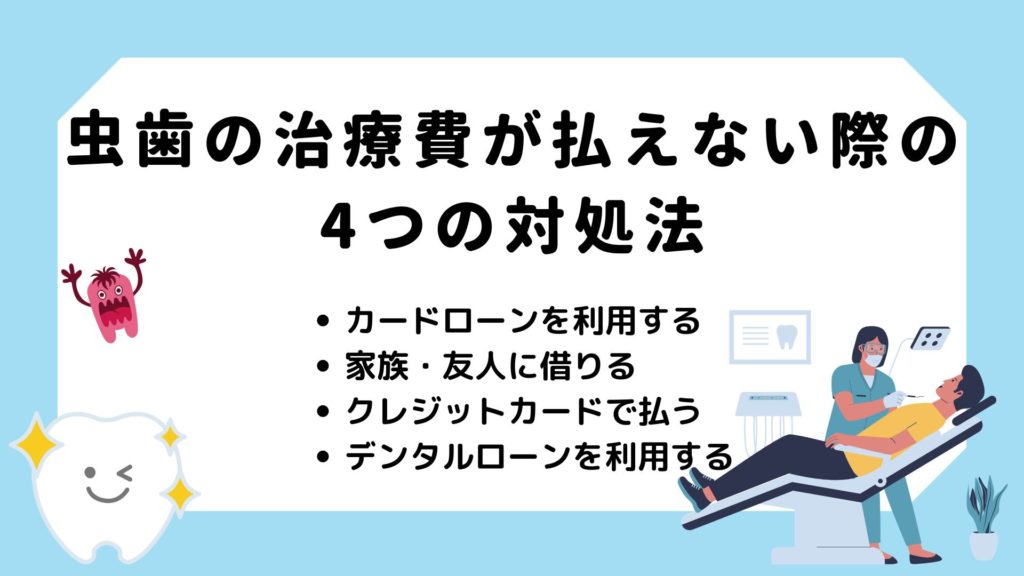 虫歯の治療費は重度であるほど高額になり、お金がない時の手持ちだけでは払えない方も多いはずです。虫歯の治療費が払えない場合には、以下の方法での対処を検討してみましょう。