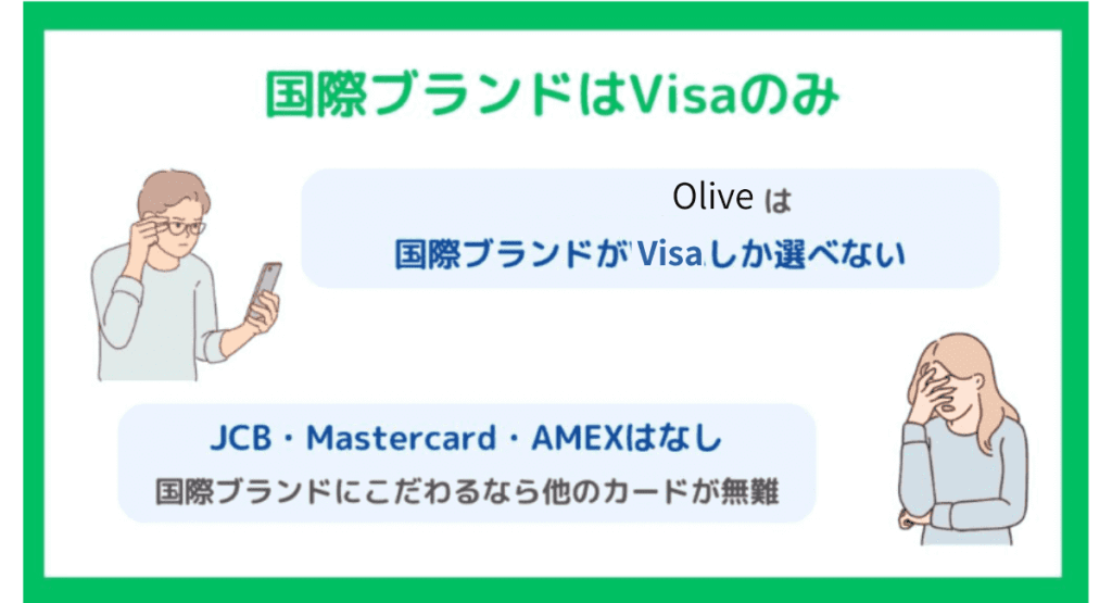 三井住友銀行のOliveのカードで利用できる国際ブランドはVisaのみという点はデメリットです。
